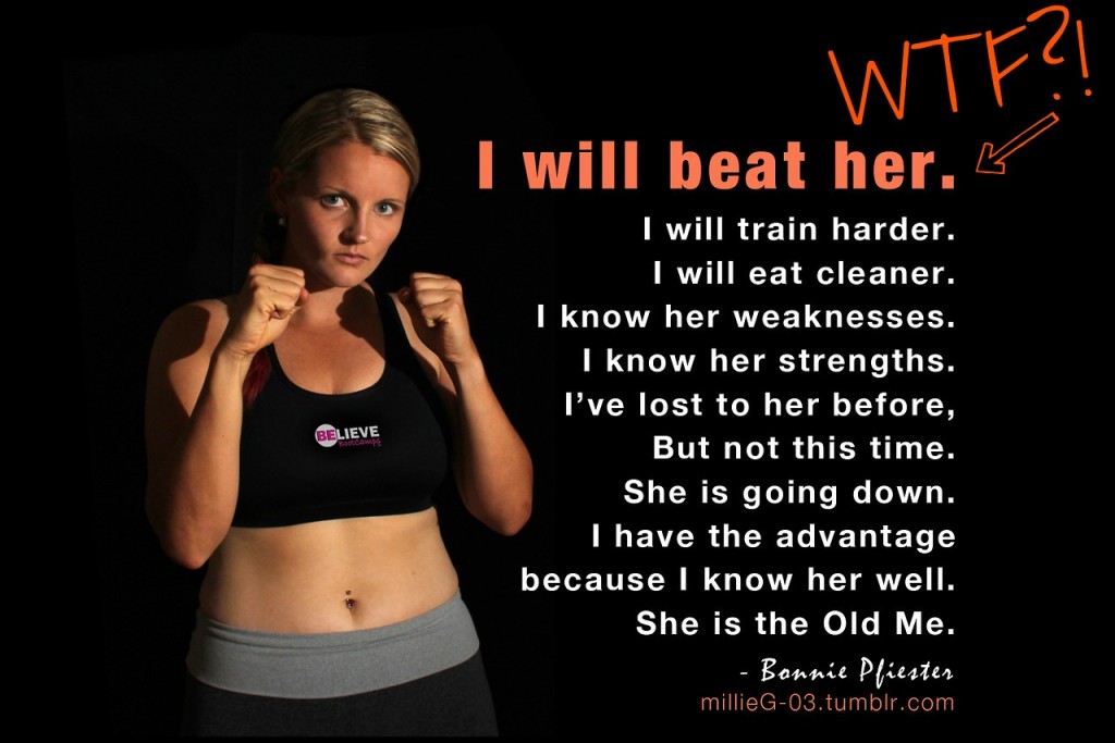 I don’t think it’s healthy to approach fitness by looking at pictures of other people and saying, “I should look like that.” I certainly don’t think it’s healthy to approach fitness by telling myself that my body is my enemy, and I need to punch my flab in the face or that I need to destroy parts of myself that aren’t “perfect.” I want to like my body. I don’t think you can ever get to a place where you truly like your body if you see yourself as constantly trying to achieve someone else’s body, which may or may not even really be their body depending on the photo, and continually looking at all you aren’t versus all you are.